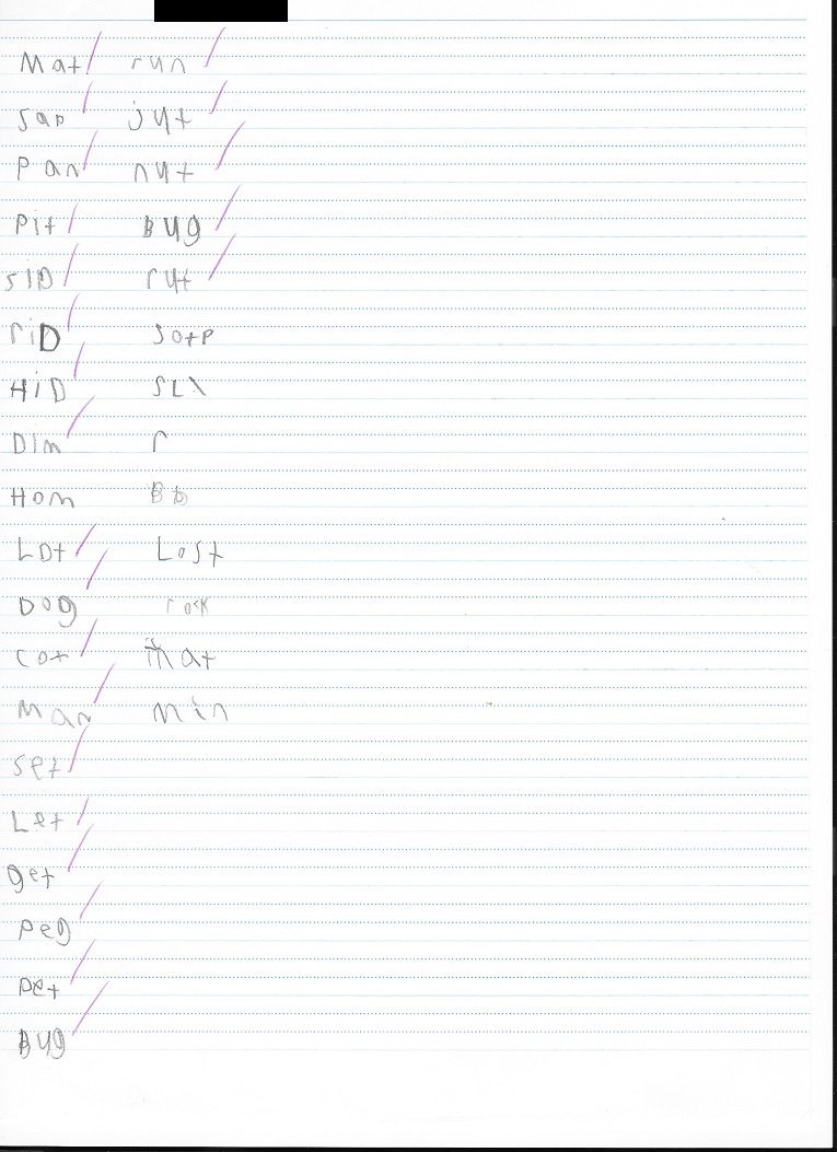 Upon advice from the teacher who has had a lot of experience with Synthetic Phonics, he suggested that the test be done through a spelling test as well as a reading test. So in following his advice, I gave the whole class a spelling test based on the words in this test. Then myself of my Education Assistant would give them an individual reading test, where they would come up and try and read the words that they had the spelling test on. When the students started struggling with the words, I would stop the test at that point.